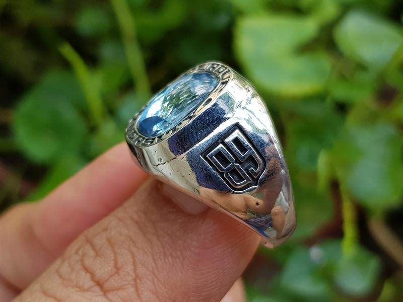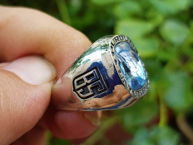 nhẫn nam kiểu mỹNhẫn mỹ University BS năm 1989Trên cùng là hột màu xanh aquamarine với bề mặt trơn bóng đáy mài đa giác lấp lánh, bao quanh hột là tên trường đại học Purdue...