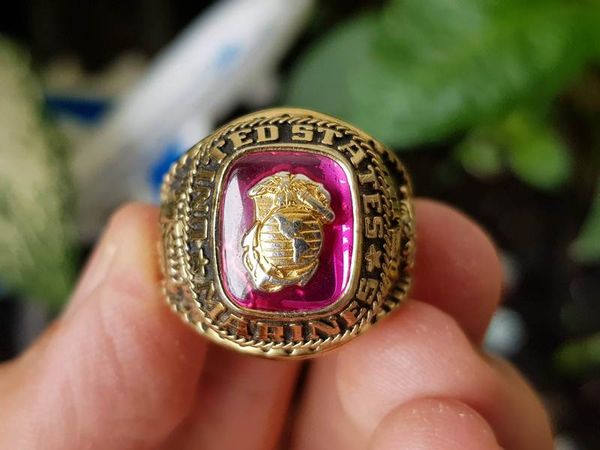 Trên cùng là hột đỏ màu Ruby láng đẹp có gắn logo của quân đoàn Thủy Quân Lục Chiến , bao quanh hột là dòng chữ United States Marines