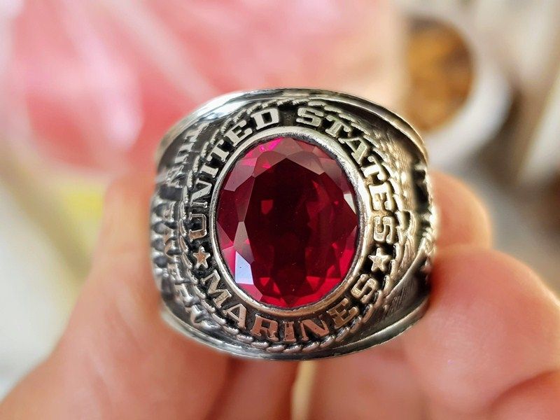 Trên cùng là hột màu đỏ Ruby có bề mặt và đáy mài đa giác hột long lanh khá bắt lửa , bao quanh hột là dòng chữ United Stated Marine