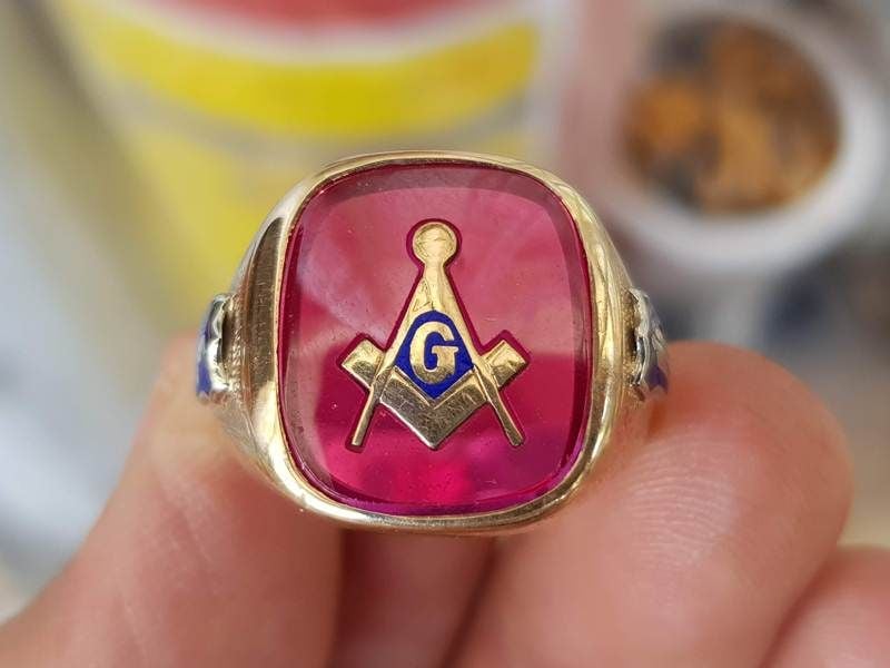 nhẫn vàng 10k masonic hội tam điểm- Thiết kế nhẫn rất sáng tài với đá màu đỏ ruby và công nghệ chạm khắc lên hột họa tiết đặc trưng Masonic được đúc bằng vàng để...