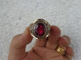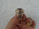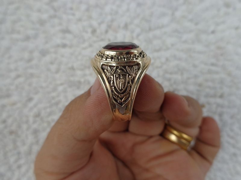 Nhẫn Vàng Mỹ 10k Năm 1958Trên cùng là hột màu đỏ ruby có bề mặt và đáy mài đa giác sáng lấp lánh, bao quanh bởi tên trường Dorchester High School 1958- Bên hông phải...
