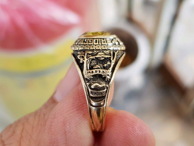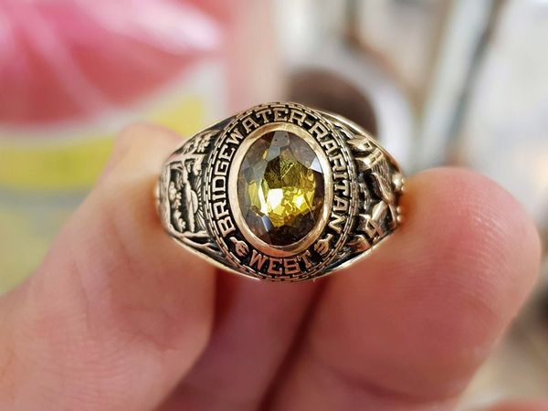 nhẫn vàng tây nam tay nhỏTrên cùng là hột màu vàng chanh có lem đáy rất giống đá tự nhiên, bề mặt mài đa giác lấp lánh, bao quanh hột là tên trường BridgeWater Raritan...