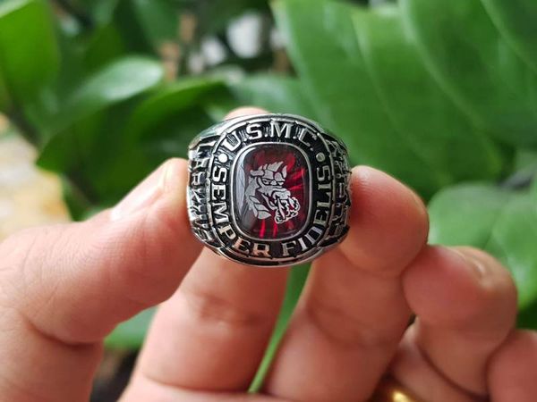 Trên cùng là hột đỏ màu ruby đỏ đáy tia lòng hột có khắc đầu rồng phun lửa , bao quanh hột là dòng chữ U.S.M.C Semper Fidelis ( Thủy quân lục chiến Hoa Kỳ luôn trung thành )